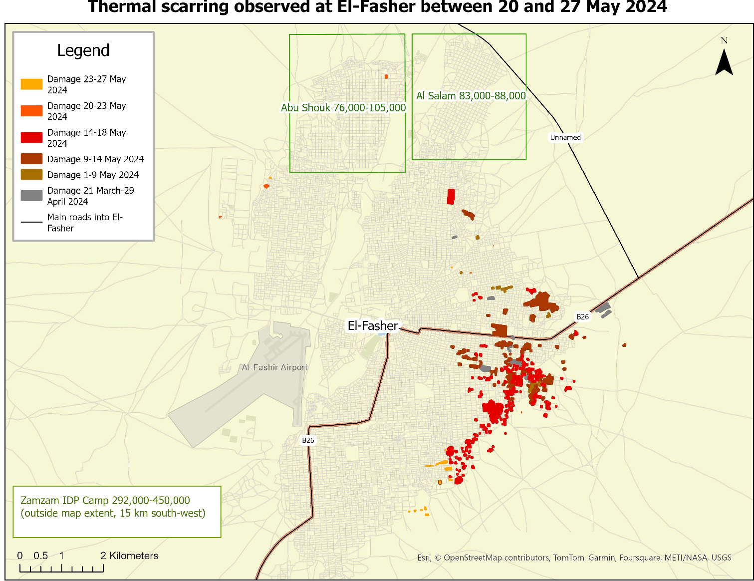 The Yale School of Public Health’s Humanitarian Research Lab (HRL) identifies individuated damage consistent with intentional attacks in the southeast neighborhood inside El-Fasher city consistent with RSF. Individuated damage refers to houses and other buildings burned by dismounted infantry. Approximately 50 structures, likely houses, are visible with active smoke plumes as well as visible active fire in imagery from 26 May 2024. The thermal scarring and smoke plumes are visible at specific buildings and notably not at other buildings and do not cross the roads or other space between buildings indicating selection. The selective nature of these burnt structures in proximity to unburnt structures, as well as the absence of ground scarring between them without impact cratering, are consistent with a targeted ground-based attack.